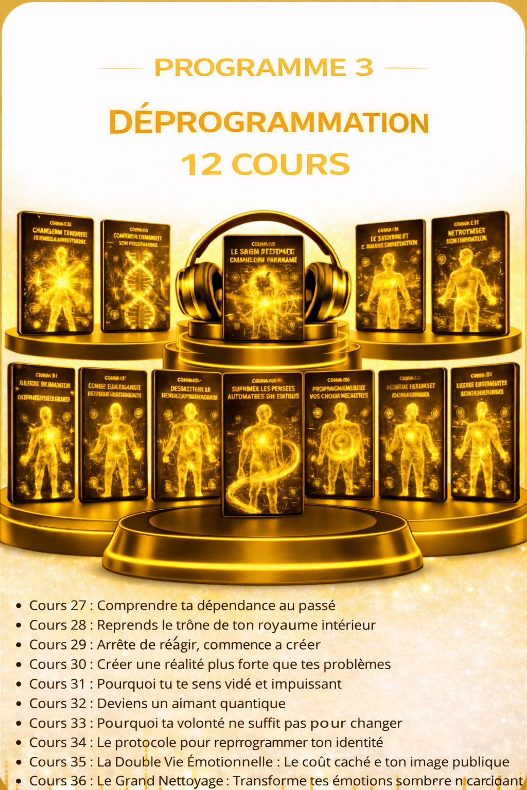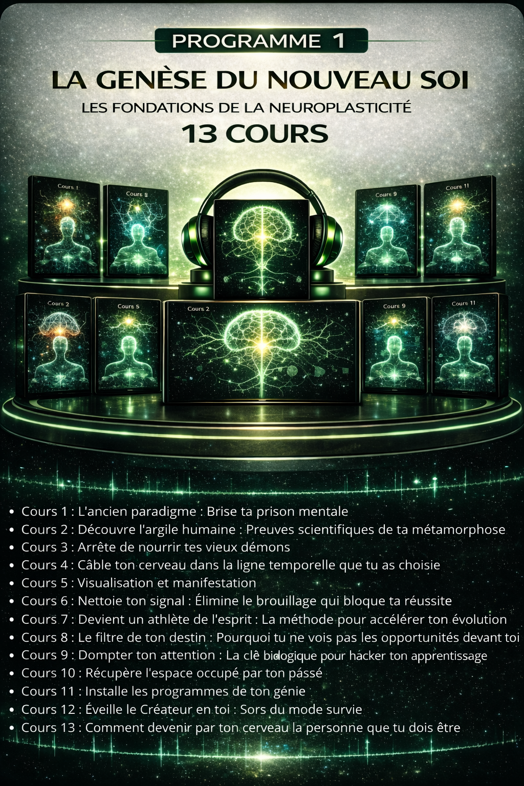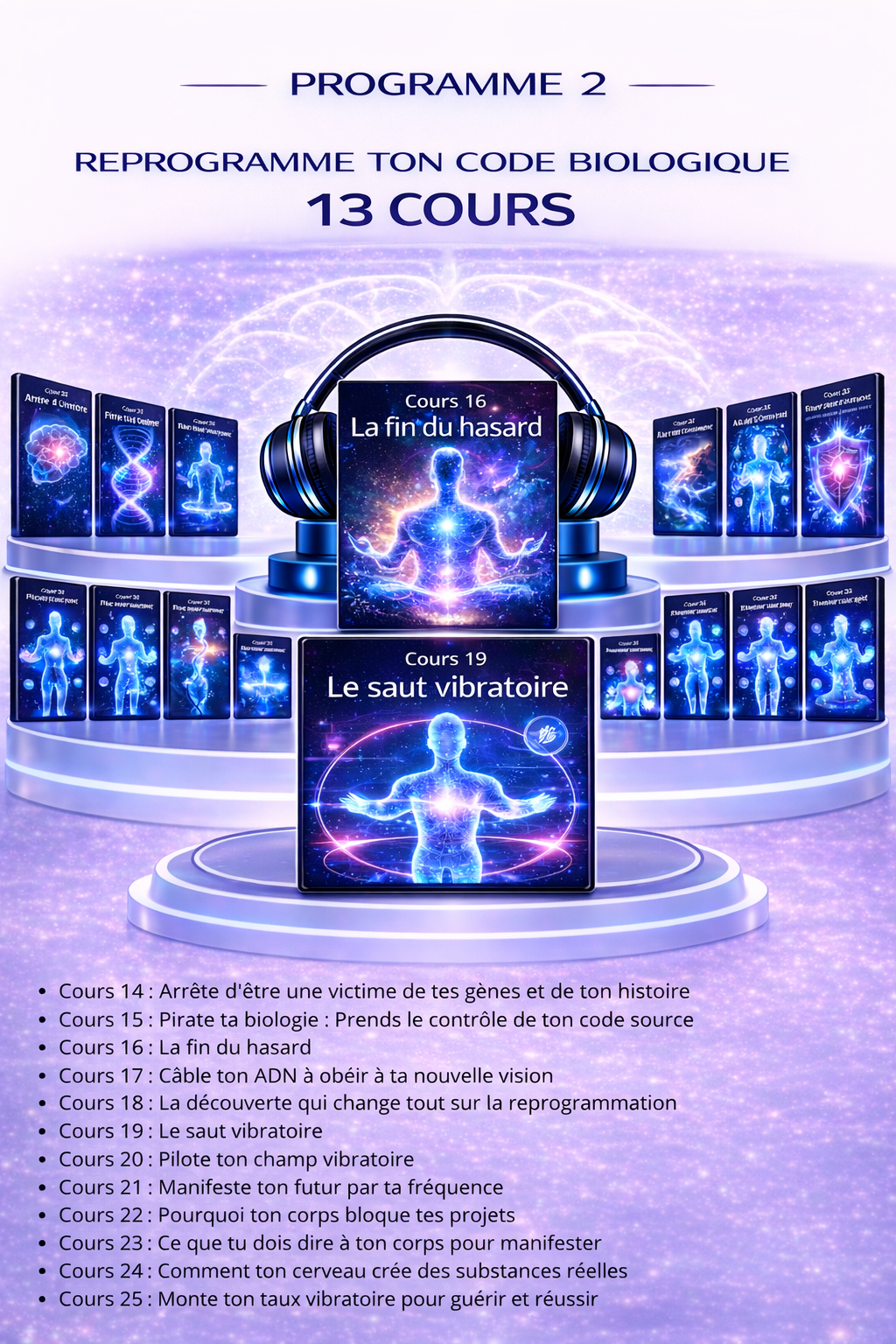 Ici, tu apprends à sortir du conditionnement génétique et émotionnel, à reprendre la main sur ta biologie interne et à aligner ton corps avec la vision que tu as choisie.